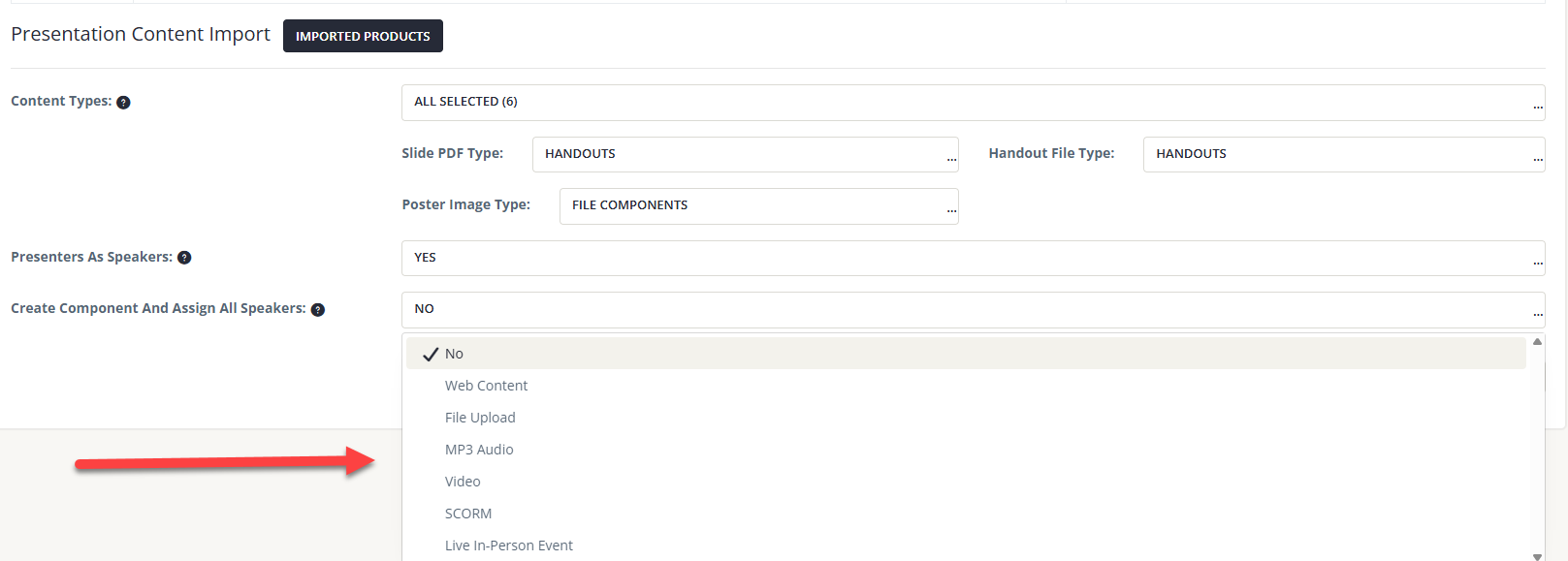 - Select the type of content you would like to import from the Content Types drop-down. Content that can be imported for each Presentation from Eventscribe will be added to Products in the following formats: